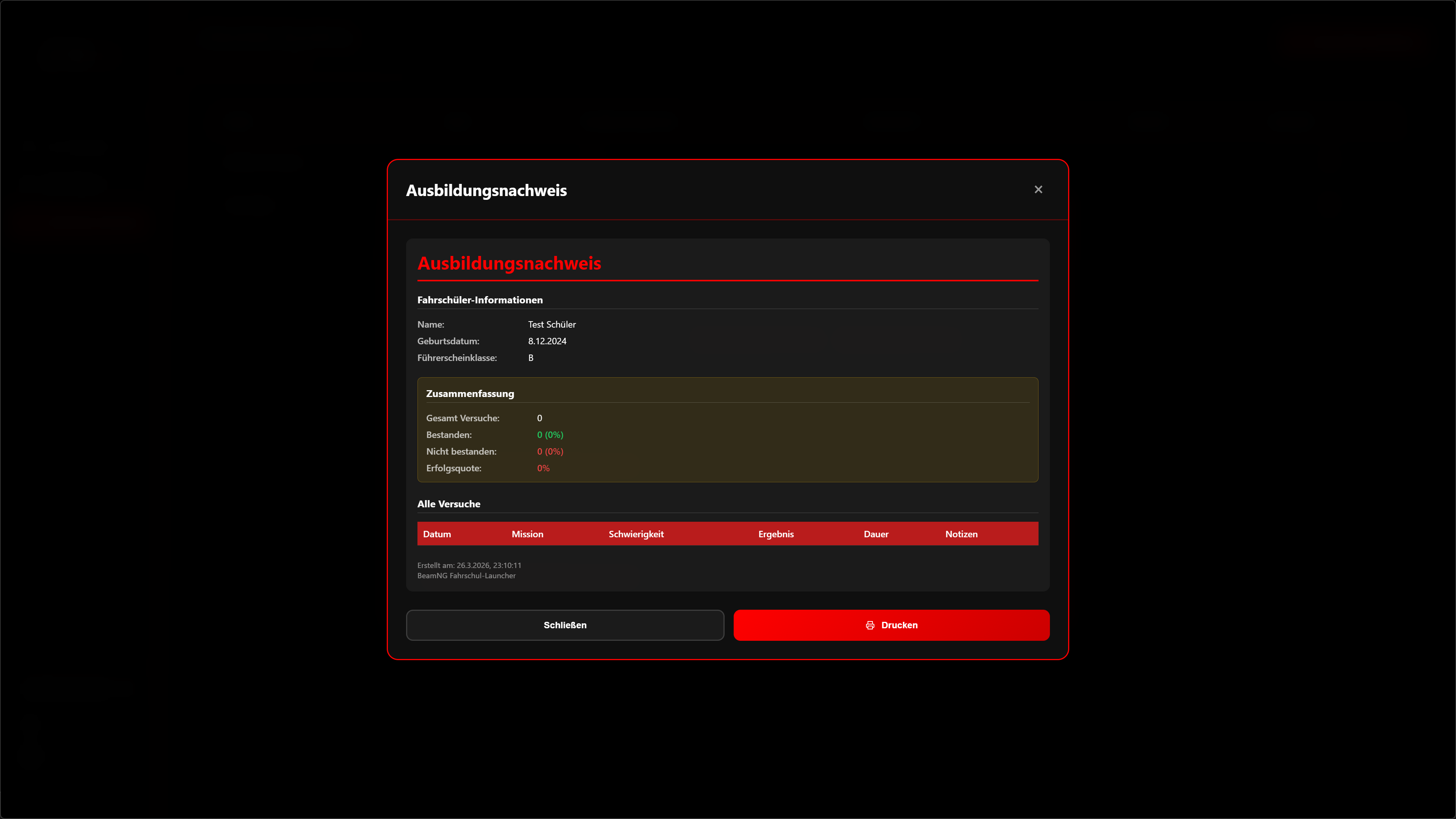 - Druckbare AusbildungsnachweiseDank direkter UDP-Schnittstelle zu BeamNG werden Resultate automatisch getrackt. Der gesamte Verlauf eines Schülers kann als detaillierter, druckfertiger Nachweis im Simulator generiert werden.