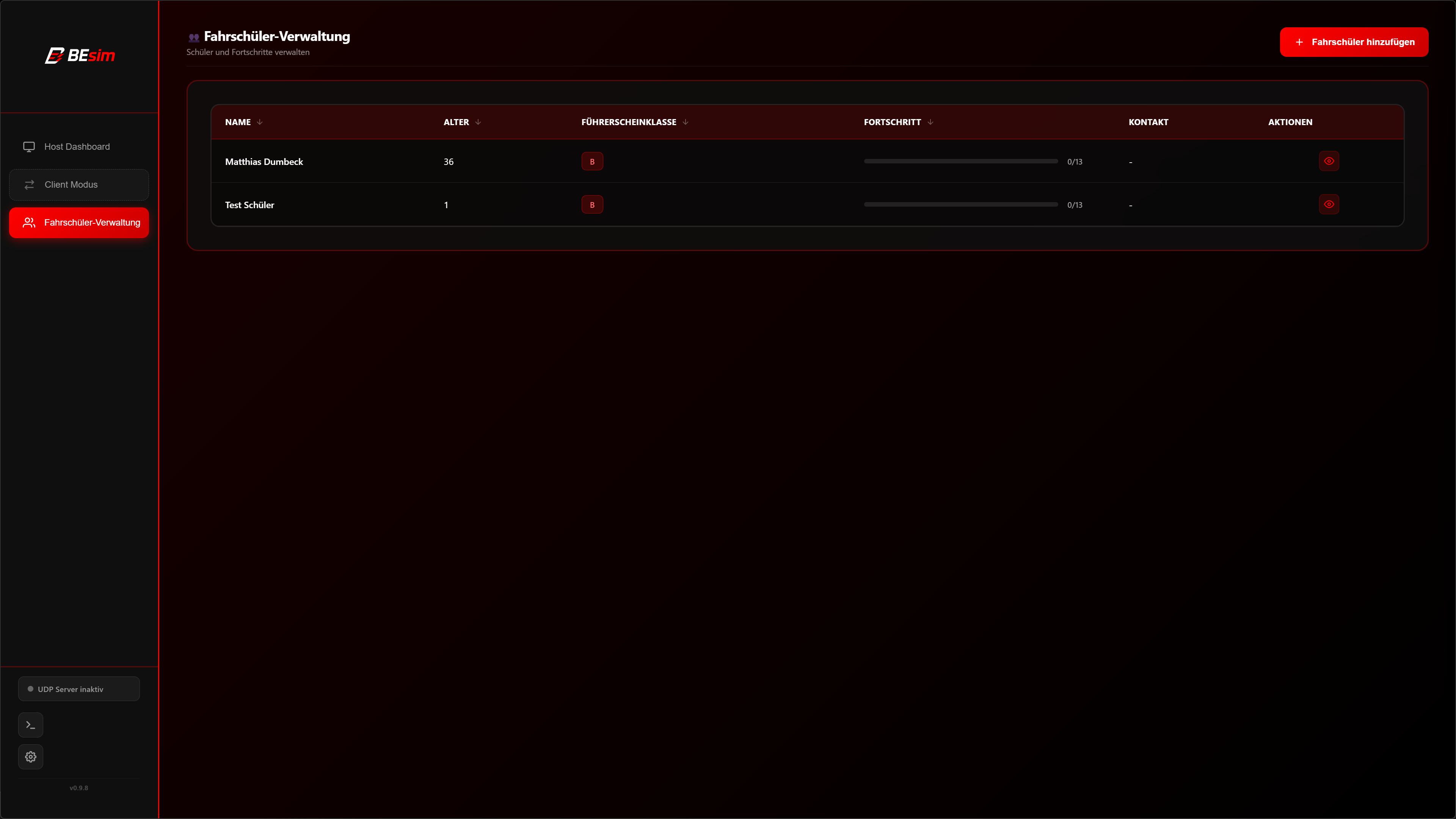 - Übersichtliche FahrschülerverwaltungEine klare, strukturierte Liste ermöglicht das einfache Anlegen neuer Profile, die Zuweisung von Führerscheinklassen und die Überwachung des Gesamtlernfortschritts aller Schüler.